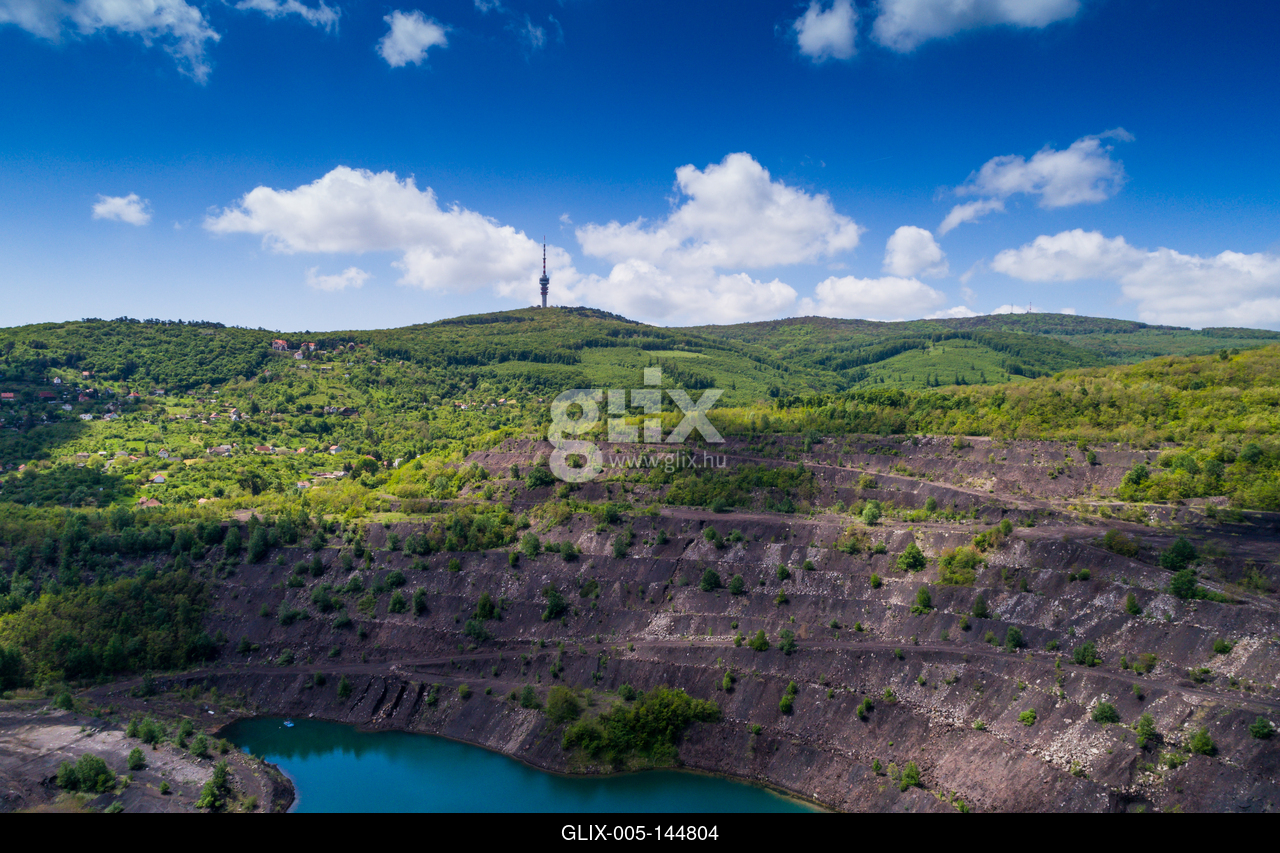 A Karolina-külfejtés és bányató látképe madártávlatból, háttérben a Mecsek csúcsai, a Misina tető a TV toronnyal. A pécsbányai Karolina-külfejtésben 2004-ig folytattak bányászati tevékenységet.Aerial view, deep mine lake in place of a mining pit