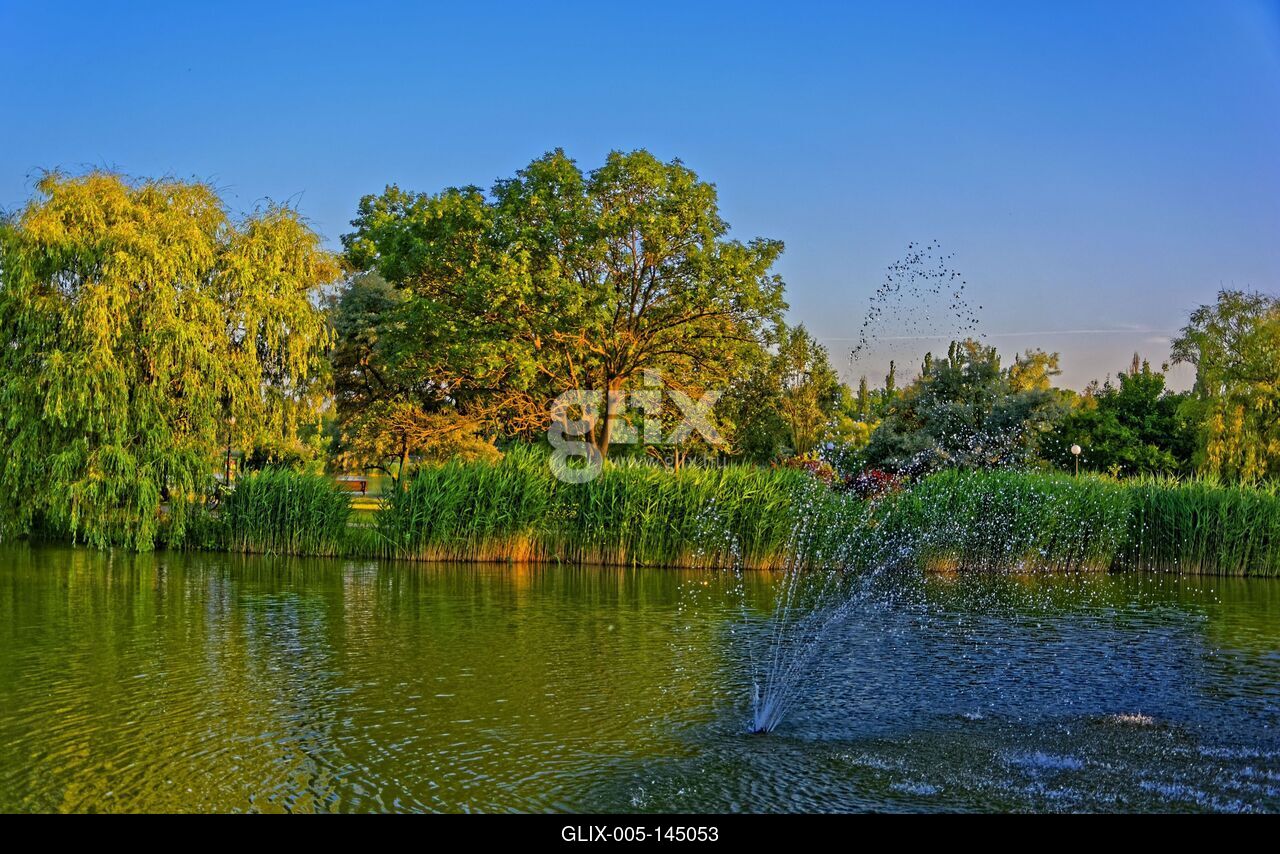 Nyíregyháza, szökőkút a Sóstóban, naplemente