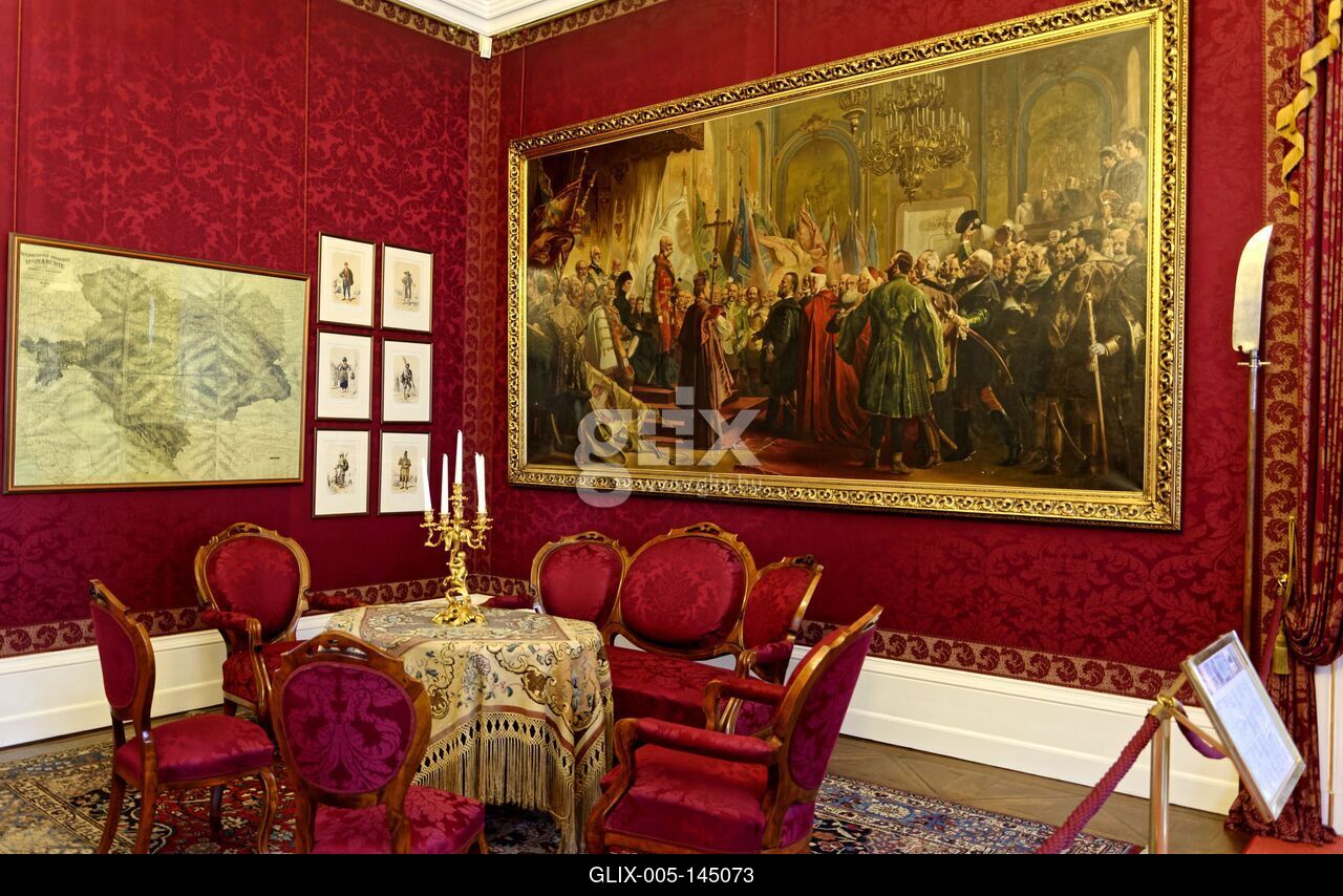Gödöllő királyi kastély, úri szalon óriási festménnyel a falon, képek, űlő garnitúra, kerek asztal
