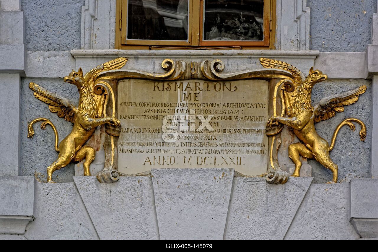 Eszterházy kastély Kismarton, kapu feletti írás latin nyelven