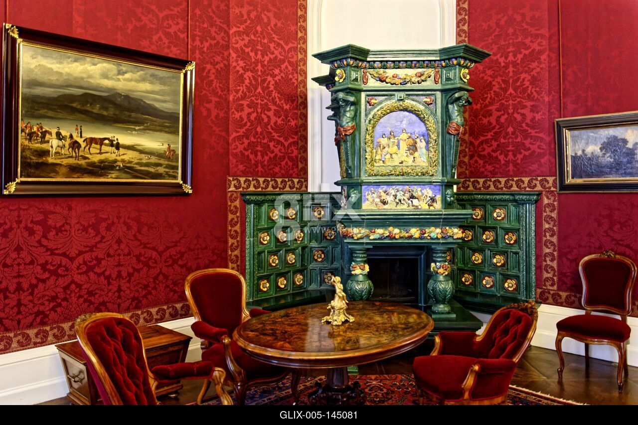 Gödöllő királyi kastély kandaló szoba zöld csempékkel, piros szövet tapéta, képek, ovális asztal székekkel