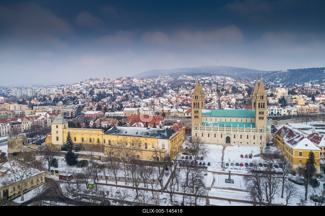 A pécsi székesegyház és környezete a március eleji havazást követően, a háttérben a Mecsek.A pécsi Szent Péter- és Szent Pál-székesegyház (pécsi dóm, bazilika vagy vártemplom) a Pécsi egyházmegye katedrálisa, a város egyik jellegzetes épülete. A 11. századi alapokkal rendelkező székesegyház mai formáját a 19. század végén érte el Pollack Mihály tervei alapján.