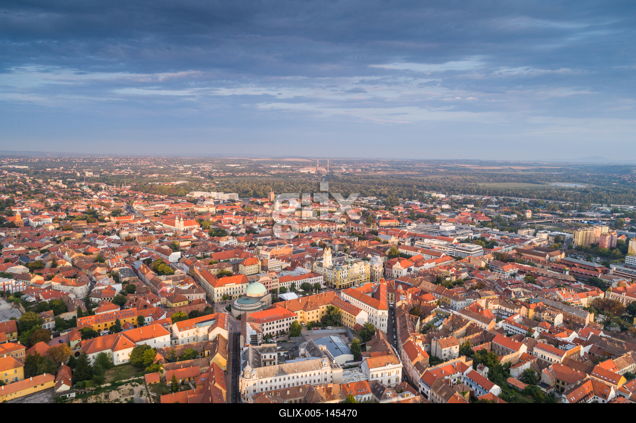 Bird eye view of beautiful Pecs.A Széchenyi tér a pécsi belváros közigazgatási, kereskedelmi és idegenforgalmi központja.