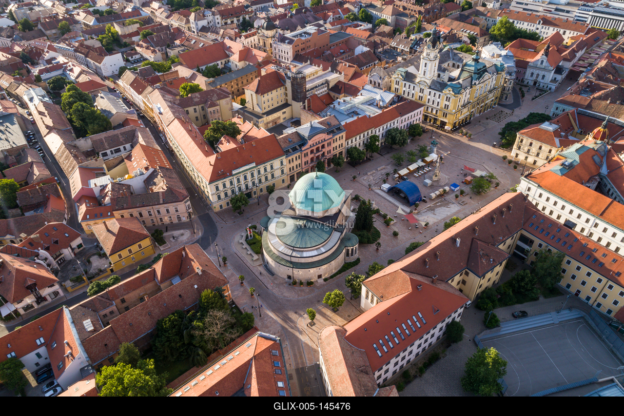 Pecs, Szekesegyhaz. Bird eye view.Pécs belvárosa a Pécsi Székesegyházzal. A pécsi Szent Péter- és Szent Pál-székesegyház (pécsi dóm, bazilika vagy vártemplom) a Pécsi egyházmegye katedrálisa, a város egyik jellegzetes épülete..A Széchenyi tér a pécsi belváros közigazgatási, kereskedelmi és idegenforgalmi központja.