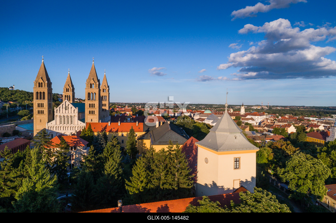 Pecs, Szekesegyhaz. Bird eye view.Pécs belvárosa a Pécsi Székesegyházzal. A pécsi Szent Péter- és Szent Pál-székesegyház (pécsi dóm, bazilika vagy vártemplom) a Pécsi egyházmegye katedrálisa, a város egyik jellegzetes épülete.