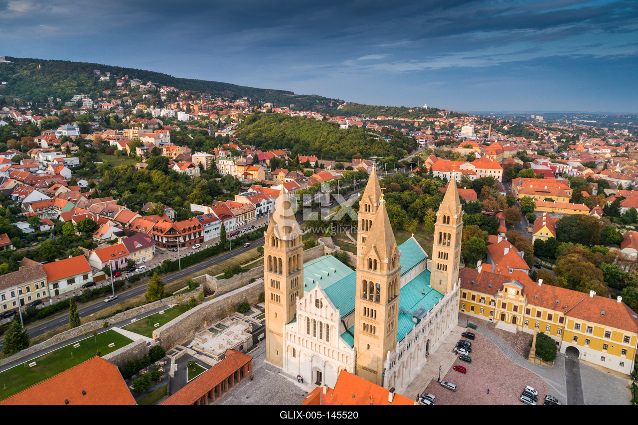 Pecs, Szekesegyhaz. Bird eye view.Pécs belvárosa a Pécsi Székesegyházzal. A pécsi Szent Péter- és Szent Pál-székesegyház (pécsi dóm, bazilika vagy vártemplom) a Pécsi egyházmegye katedrálisa, a város egyik jellegzetes épülete.