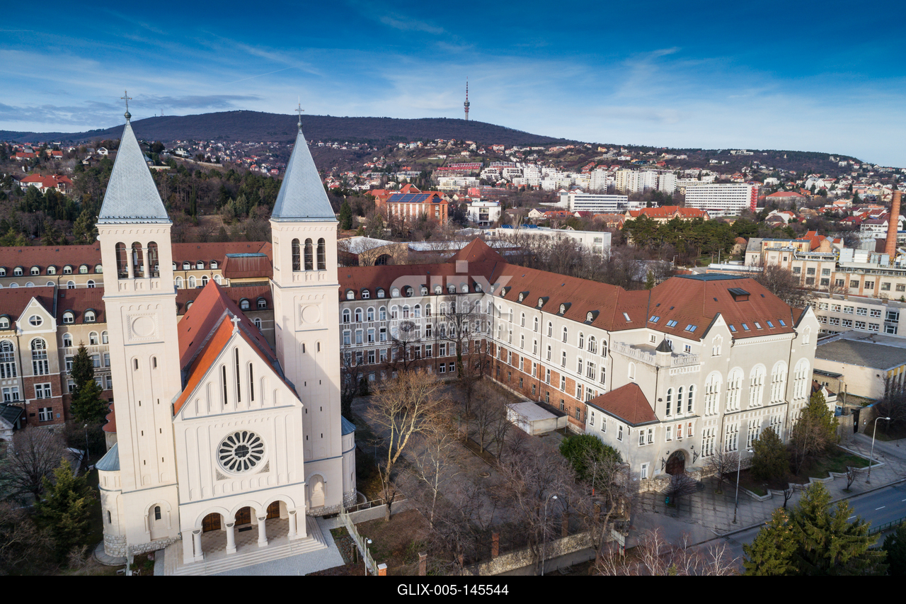 Pecs, Pius church. Bird eye view.Pius templom (Jézus Szíve templom) Pécs belvárosában, madártávlatból. A szomszédos épületekben a Pécsi Tudományegyetem (PTE) természettudományi és bölcsészettudományi kara működik.