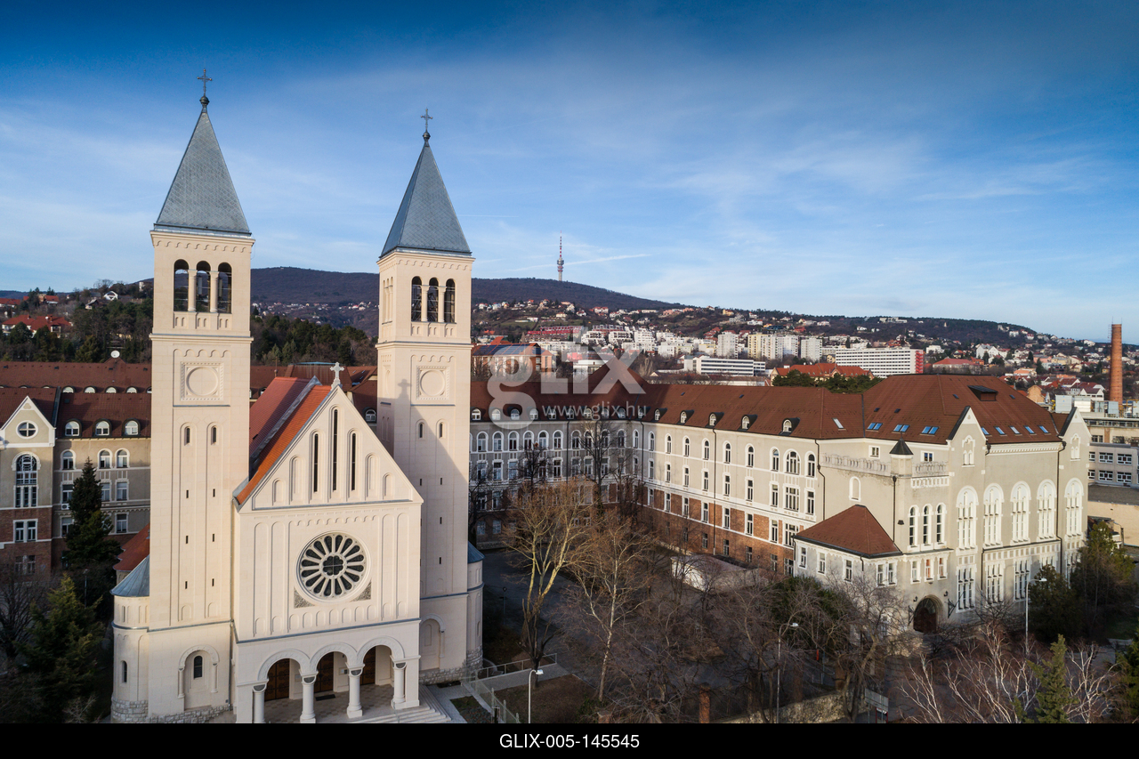 Pecs, Pius church. Bird eye view.Pius templom (Jézus Szíve templom) Pécs belvárosában, madártávlatból. A szomszédos épületekben a Pécsi Tudományegyetem (PTE) természettudományi és bölcsészettudományi kara működik.