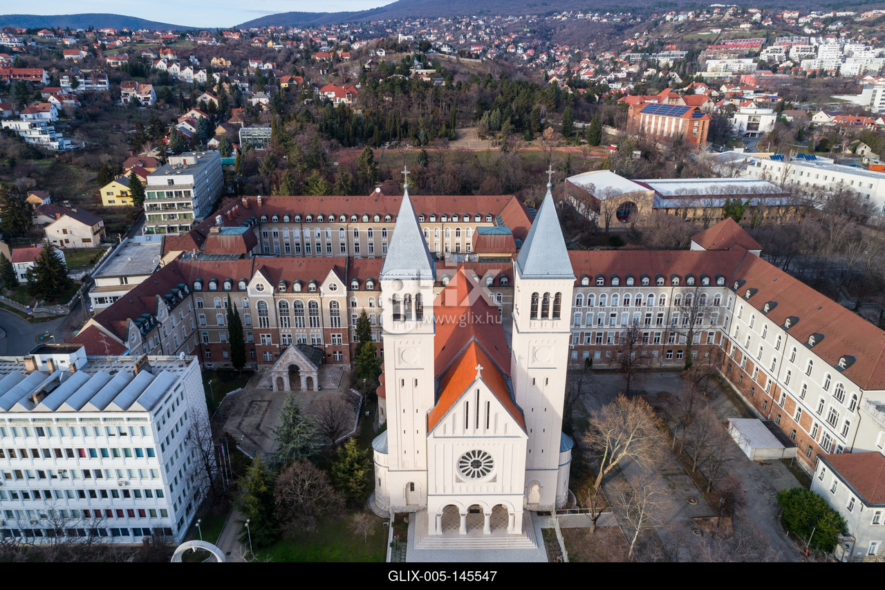 Pecs, Pius church. Bird eye view.Pius templom (Jézus Szíve templom) Pécs belvárosában, madártávlatból. A szomszédos épületekben a Pécsi Tudományegyetem (PTE) természettudományi és bölcsészettudományi kara működik.