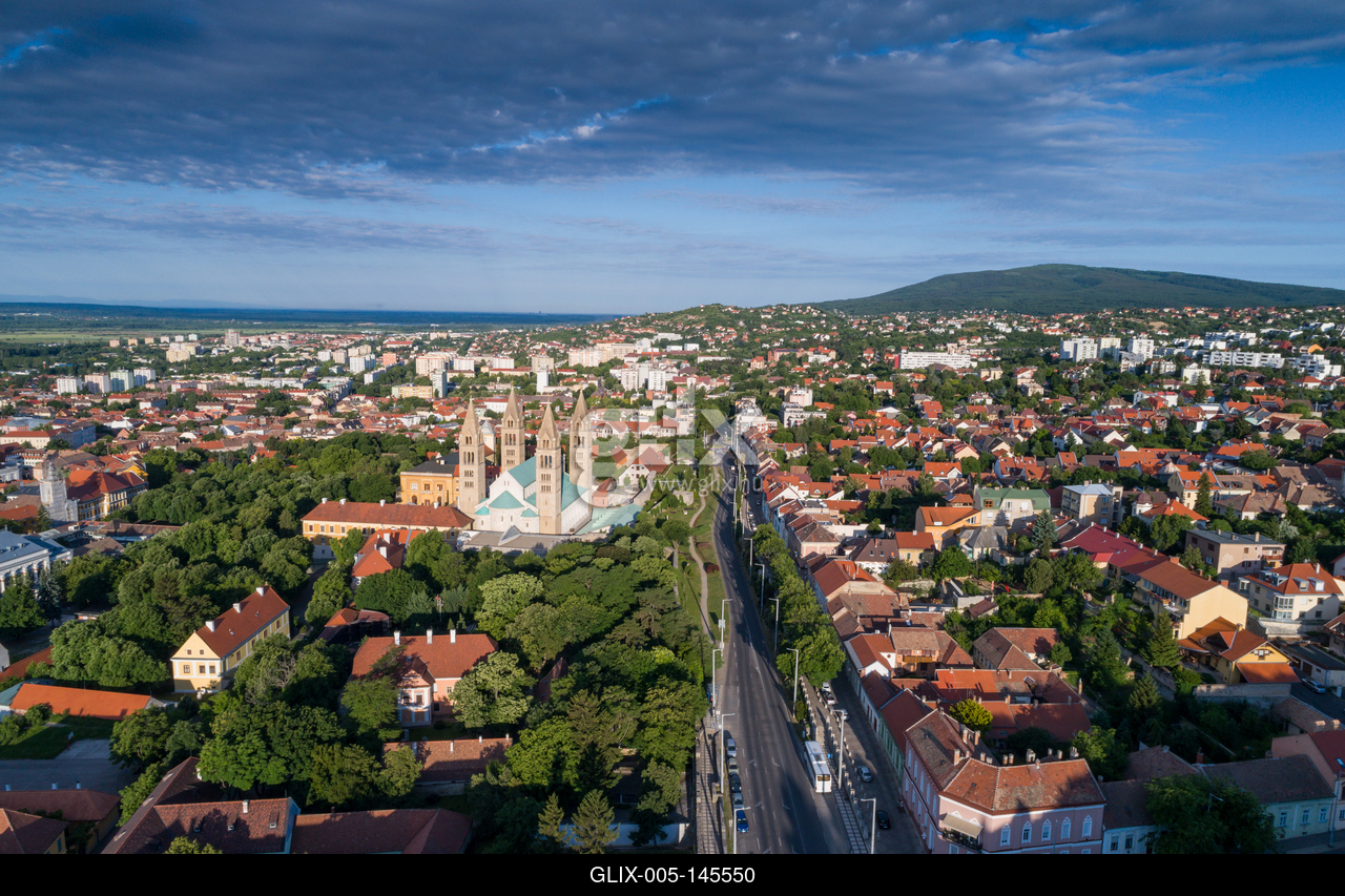 Pecs, Szekesegyhaz. Bird eye view.Pécs belvárosa a Pécsi Székesegyházzal. A pécsi Szent Péter- és Szent Pál-székesegyház (pécsi dóm, bazilika vagy vártemplom) a Pécsi egyházmegye katedrálisa, a város egyik jellegzetes épülete.