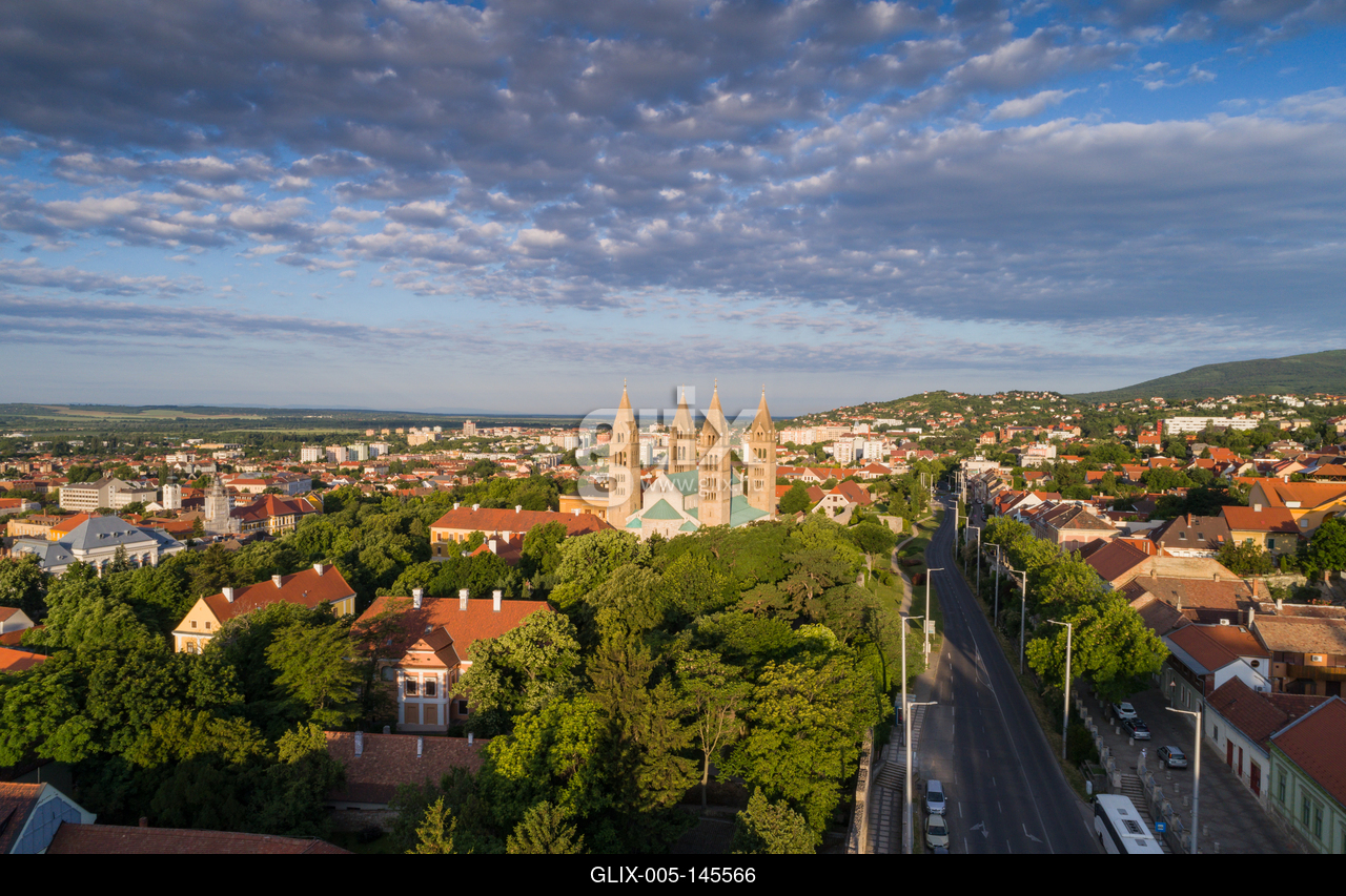Pecs, Szekesegyhaz. Bird eye view.Pécs belvárosa a Pécsi Székesegyházzal. A pécsi Szent Péter- és Szent Pál-székesegyház (pécsi dóm, bazilika vagy vártemplom) a Pécsi egyházmegye katedrálisa, a város egyik jellegzetes épülete.