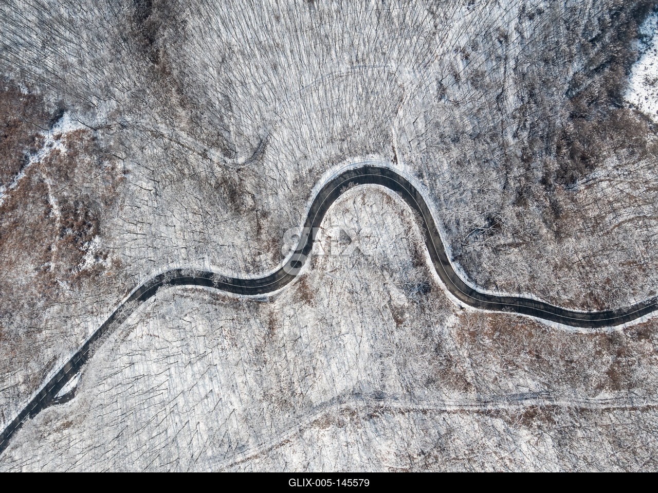 Aerial view of curvy road in Mecsek forest st winter.Erdei út a Mecsekben Pécs környékén télen, madártávlatból.