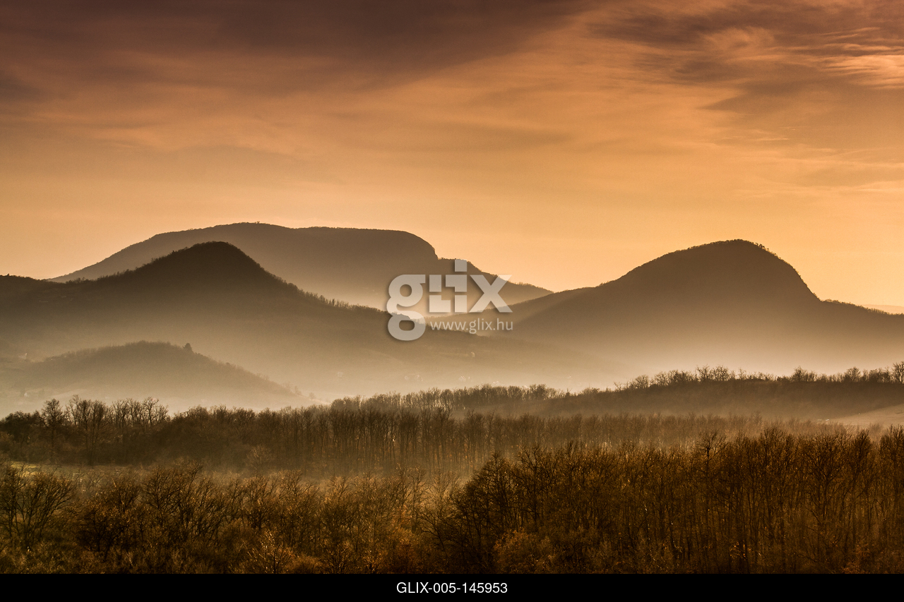 A Tapolcai-medence vulkanikus tanúhegyei egy őszi naplemente idején.
