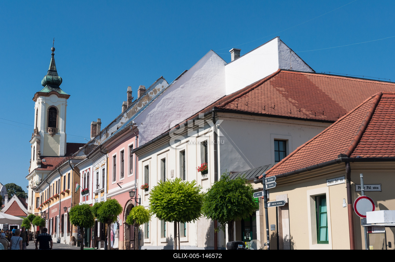 Szentendre, a Gyümölcsoltó Boldogasszony (Blagovesztenszka) templom és a Fő tér műemlék házai. A Fő tér színpompás barokk, rokokó és copf stílusú házai megőrizték a régi kereskedőházak arányát. Építtetőik, a török elől Szentendrére menekült szerb és görög kereskedők, magukkal hozták mediterrán világukat, melynek hangulatát beleépítettek a házak köveibe
