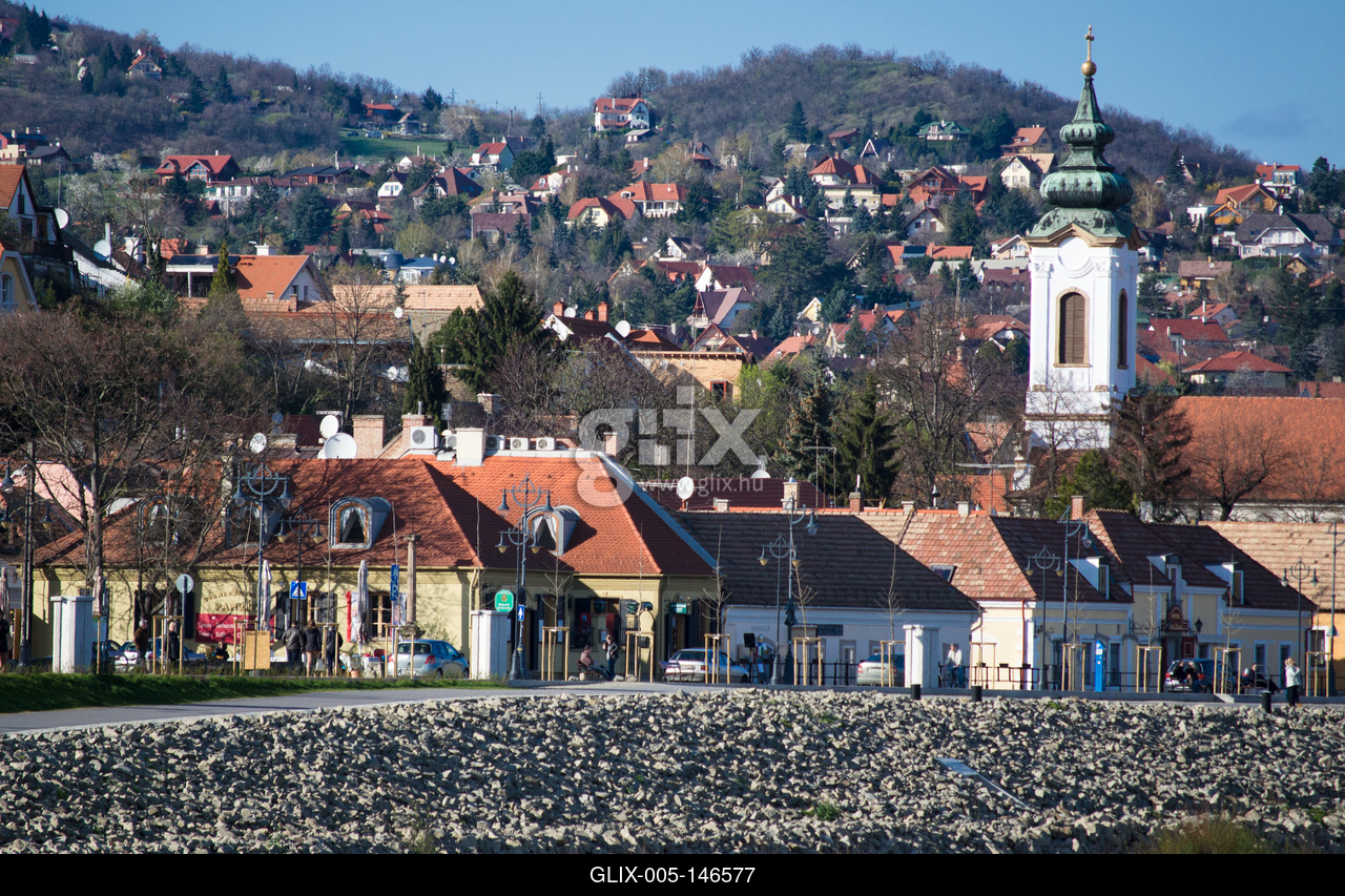 Szentendre látványa a Dunapartról. Szentendre a Dunakanyar egyik legszebb települése mediterrán atmoszférájával, hangulatos macskaköves utcácskáival.