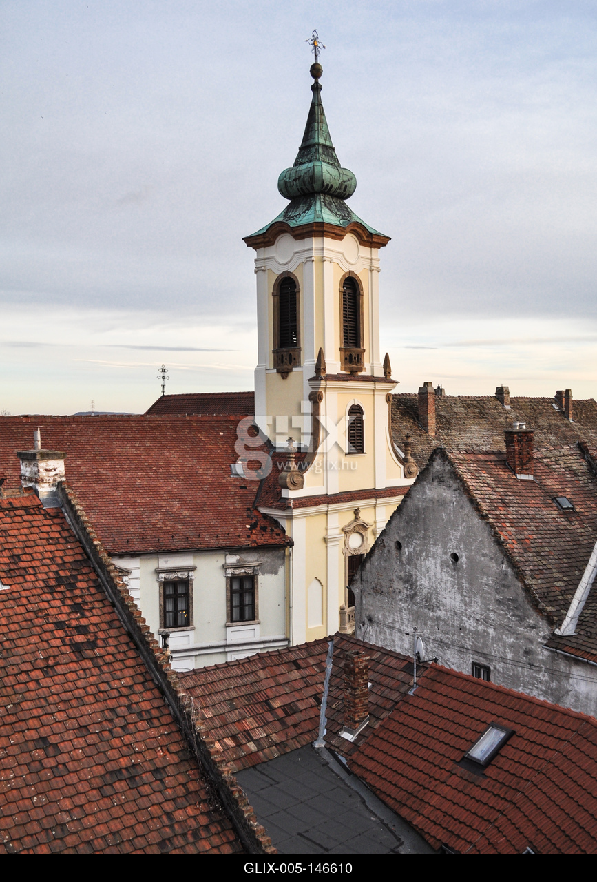 Szentendre, a Gyümölcsoltó Boldogasszony (Blagovesztenszka) templom látványa a Várdombról. A város Fő terén álló templomot eredetileg 1690-ben a Brankovics dinasztia szentjeinek földi maradványait a törökök elöl Szentendrére menekítő szerémségi szerzetesek emelték. A mai templom ennek a fatemplomnak a helyén épült 1752-ben Mayerhoffer András tervei alapján. A város egyik jelképének számító templom védőszentje Gyümölcsoltó Boldogasszony.