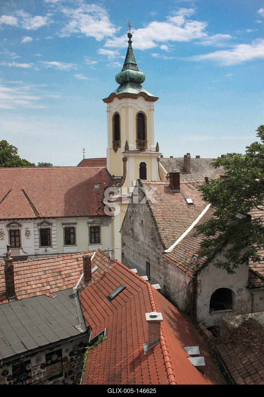 Szentendre, a Gyümölcsoltó Boldogasszony (Blagovesztenszka) templom látványa a Várdombról. A város Fő terén álló templomot eredetileg 1690-ben a Brankovics dinasztia szentjeinek földi maradványait a törökök elöl Szentendrére menekítő szerémségi szerzetesek emelték. A mai templom ennek a fatemplomnak a helyén épült 1752-ben Mayerhoffer András tervei alapján. A város egyik jelképének számító templom védőszentje Gyümölcsoltó Boldogasszony.