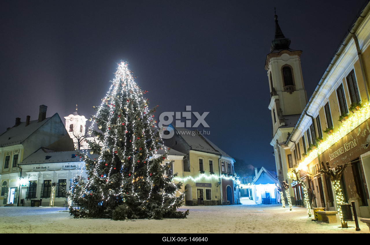 Szentendre, a Fő tér télen. A Fő tér színpompás barokk, rokokó és copf stílusú házai megőrizték a régi kereskedőházak arányát. Építtetőik, a török elől Szentendrére menekült szerb és görög kereskedők, magukkal hozták mediterrán világukat, melynek hangulatát beleépítettek a házak köveibe