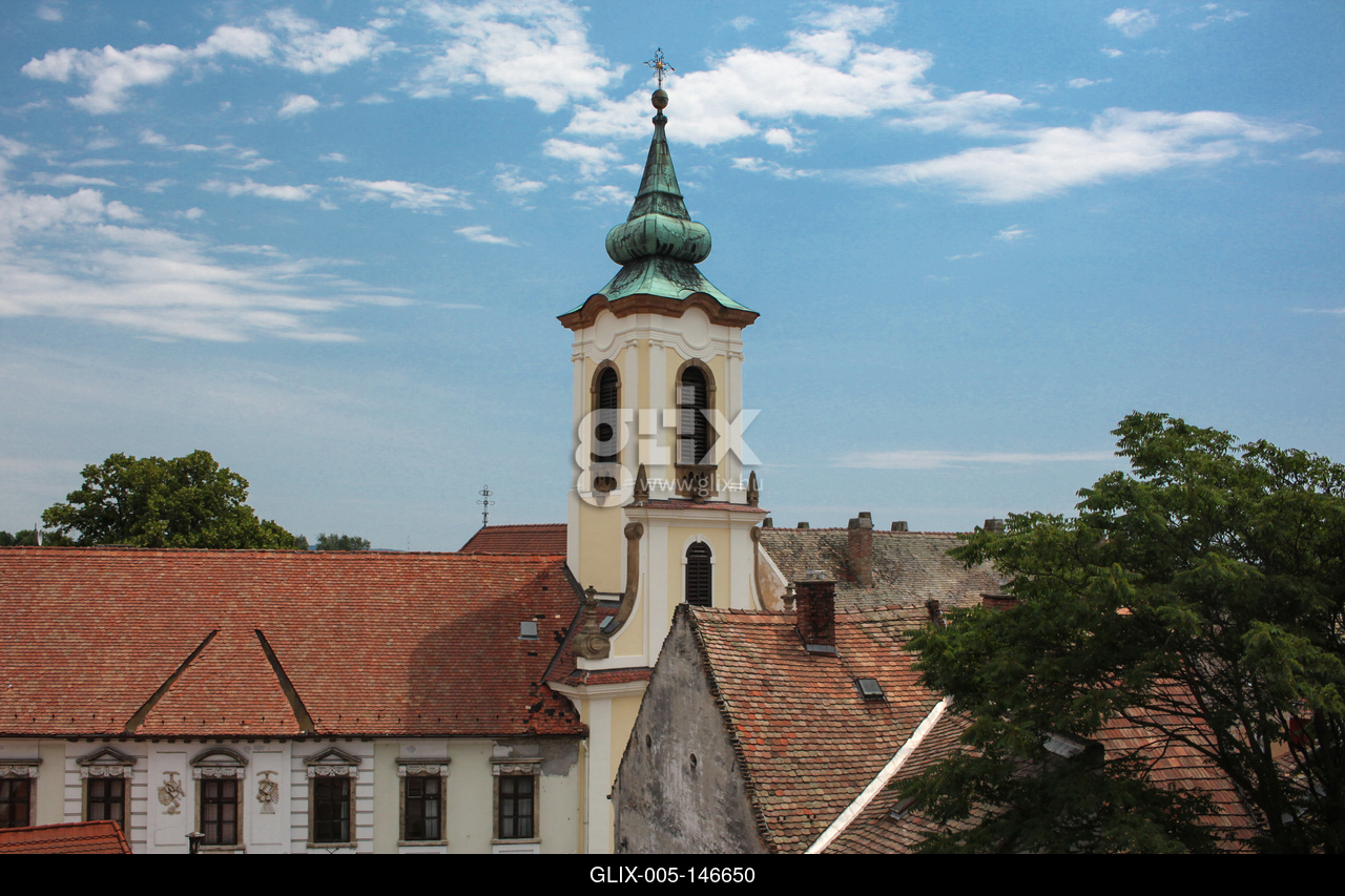 Szentendre, a Gyümölcsoltó Boldogasszony (Blagovesztenszka) templom látványa a Várdombról. A város Fő terén álló templomot eredetileg 1690-ben a Brankovics dinasztia szentjeinek földi maradványait a törökök elöl Szentendrére menekítő szerémségi szerzetesek emelték. A mai templom ennek a fatemplomnak a helyén épült 1752-ben Mayerhoffer András tervei alapján. A város egyik jelképének számító templom védőszentje Gyümölcsoltó Boldogasszony.