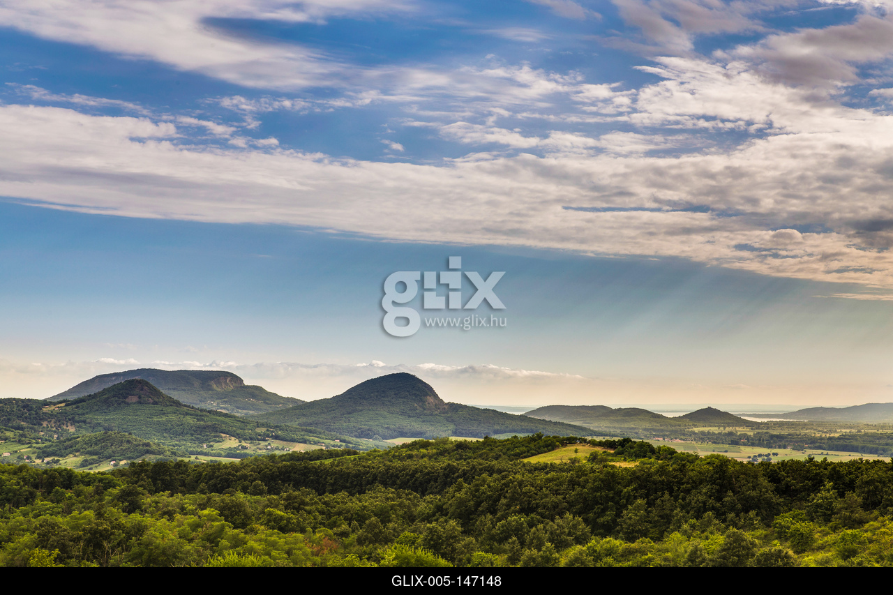 Nyári tájkép egy Balaton-felvidéki hegytetőről, a Káli-medencében, a Tapolcai-medence irányába.