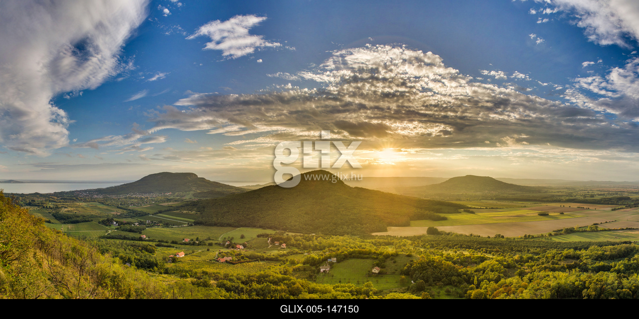Balaton-felvidéki tájkép a tanúhegyekkel, köztük a Badacsonnyal, egy gyönyörű naplementével a háttérben.