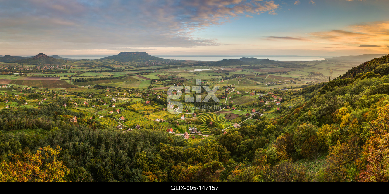 Őszi tájkép a Balaton-felvidékről, naplemente idején, háttérben a Balaton és a Badacsony.