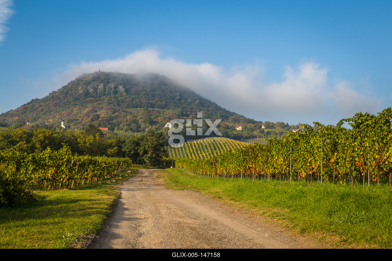 Balaton-felvidéki tájkép, az előtérben szőlősorok, a háttérben a Csobánc tanúhegy.