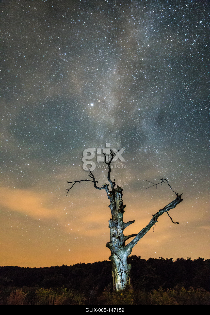 Magányos fa éjjel a Káli-medencében, a háttérben a csillagos égbolttal és a tejúttal.
