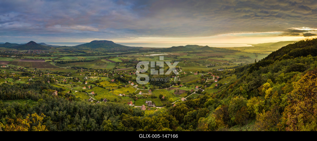 Őszi tájkép a Balaton-felvidékről, naplemente idején, háttérben a Balaton és a Badacsony.