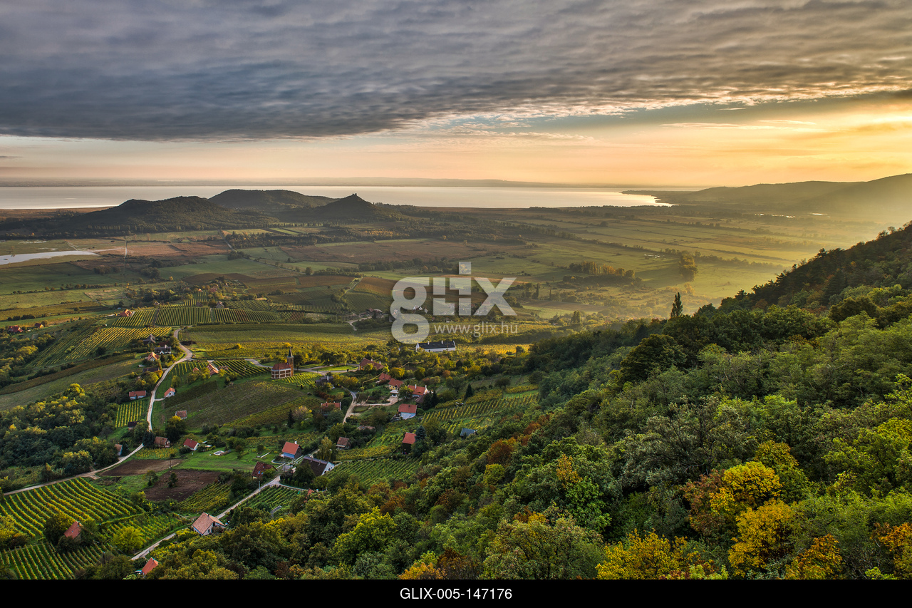 Őszi tájkép a Balaton-felvidékről, naplemente idején, háttérben a Balaton és Szigliget.