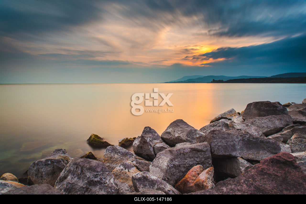 Balatoni naplemente az előtérben sziklás, köves parttal, a háttérben a tanúhegyekkel.