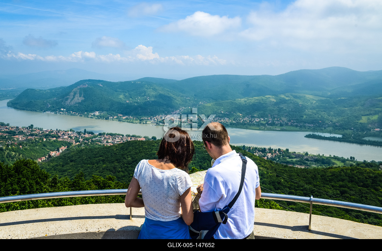 Turisták gyönyörködnek a kilátásban a Julianus-kilátóról a Hegyes-tetőn, Nagymaros felett, a Börzsönyben. A Hegyes-tető 482 méter magas csúcsán álló Julianus-kilátóból a Dunára, a Visegrádi-hegységre és a Börzsönyre is páratlan panoráma nyílik.
