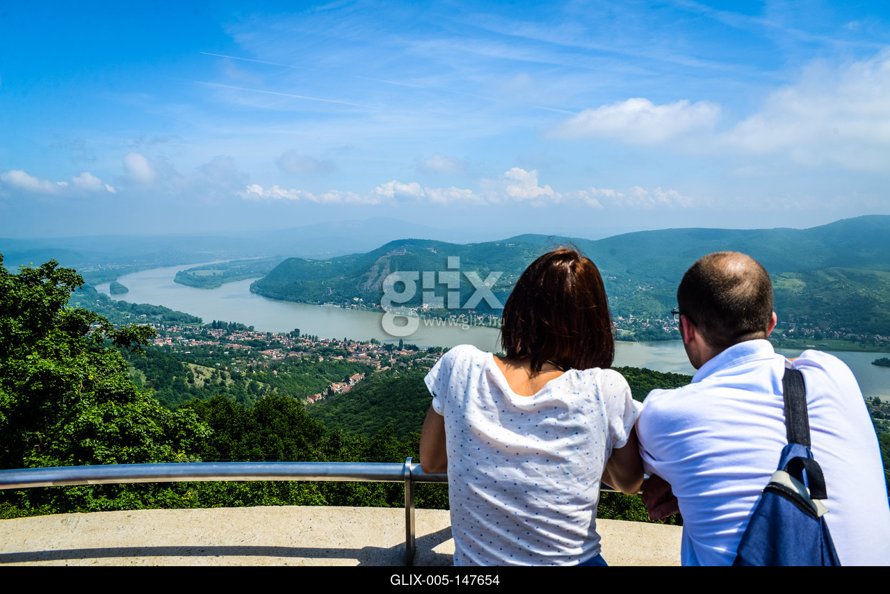 Turisták gyönyörködnek a kilátásban a Julianus-kilátóról a Hegyes-tetőn, Nagymaros felett, a Börzsönyben. A Hegyes-tető 482 méter magas csúcsán álló Julianus-kilátóból a Dunára, a Visegrádi-hegységre és a Börzsönyre is páratlan panoráma nyílik.