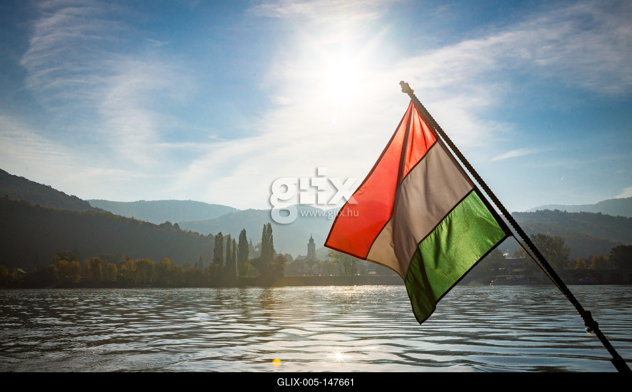 A visegrádi komp zászlója átkelés közben a Dunán, a háttérben Visegrád és Visegrádi-hegység vonulatai.