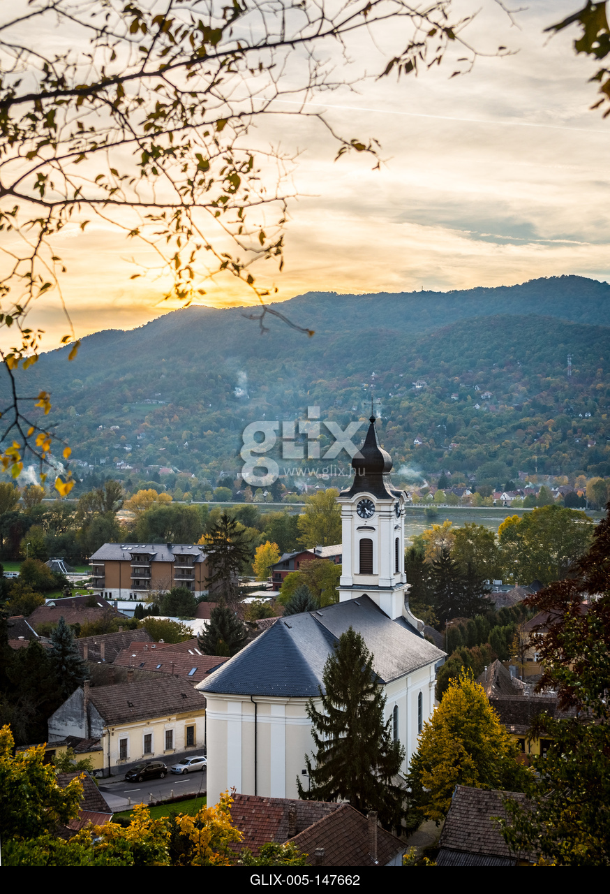 A Keresztelő Szent János Római Katolikus Plébániatemplom alkonyatkor. A barokk stílusú templom az 1700-as évek második felében épült. A Duna túloldalán a Börzsöny lankái és Nagymaros.