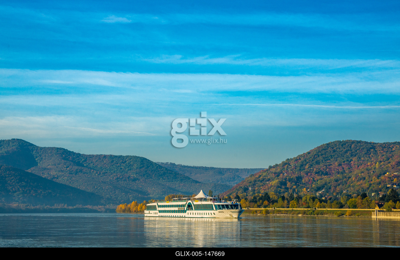 Kirándulóhajó a Dunakanyarban, a háttérben a Visegrádi-hegység és a Börzsöny vonulatai.