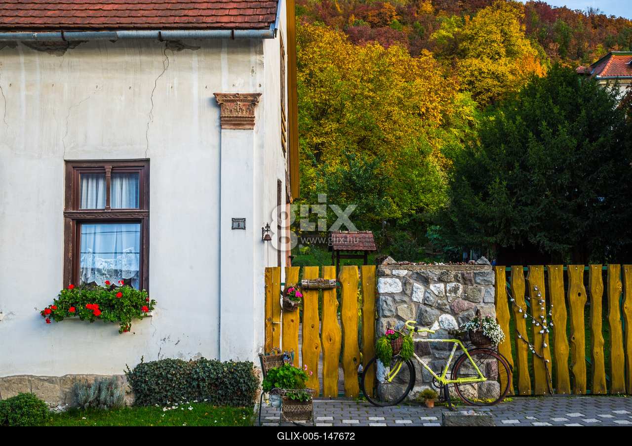 Visegrádi utcrészlet virágállványnak használt biciklivel.