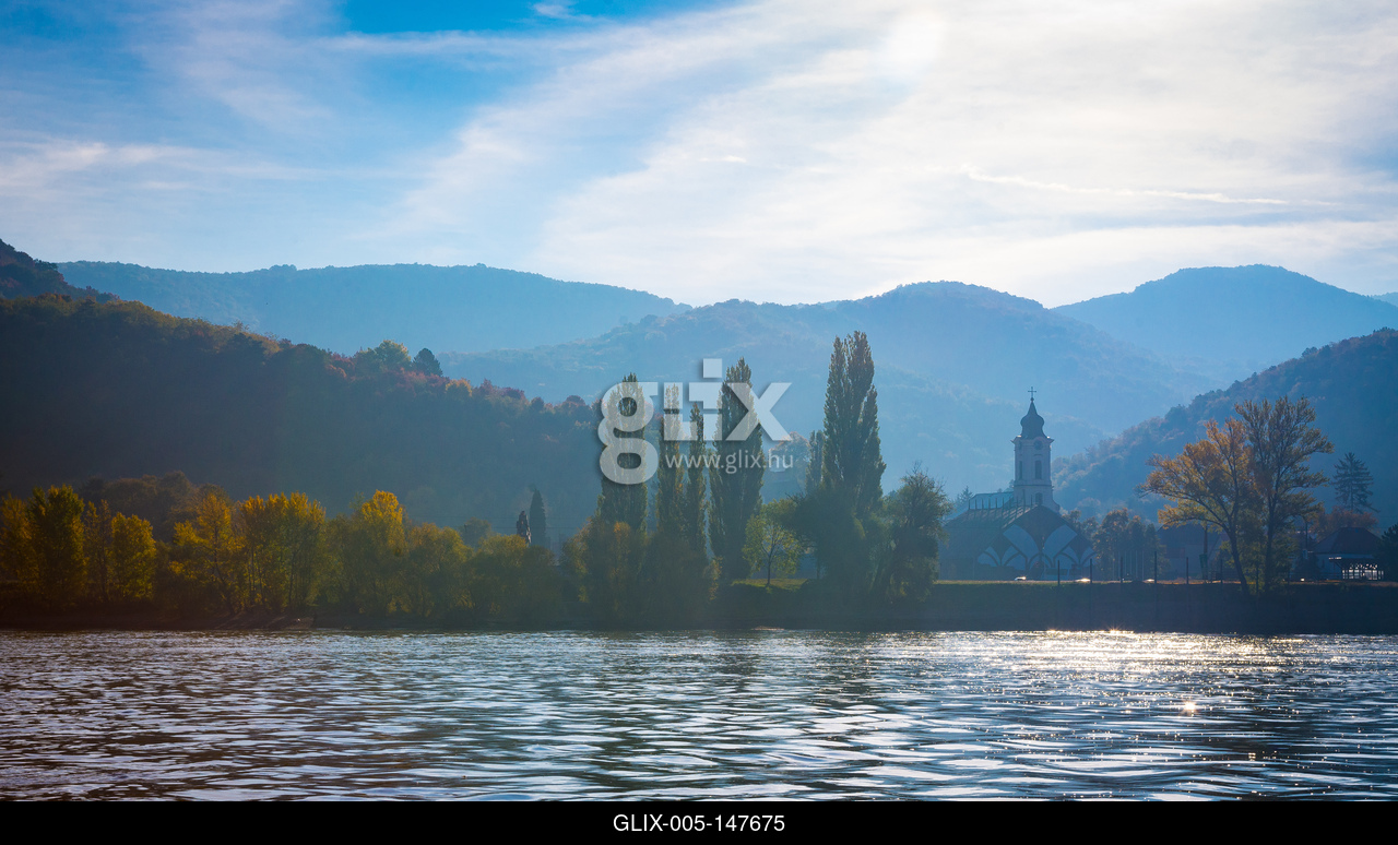 Visegrád látképe a hajnali párában átkelés közben a Dunán, a háttérben a Visegrádi-hegység vonulatai.