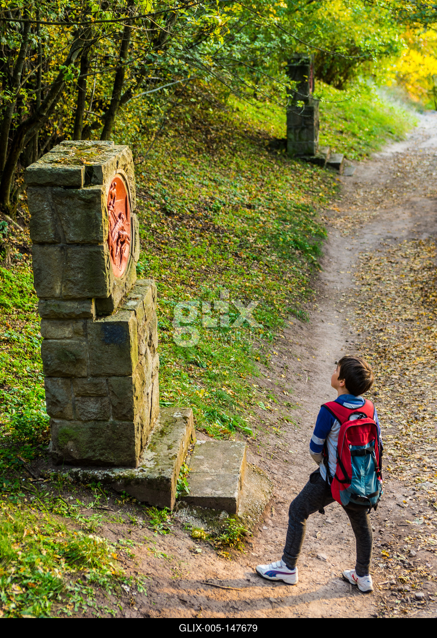 Fiú nézi a Kálvária egyik stációját, amely a település fölött lévő dombon áll.