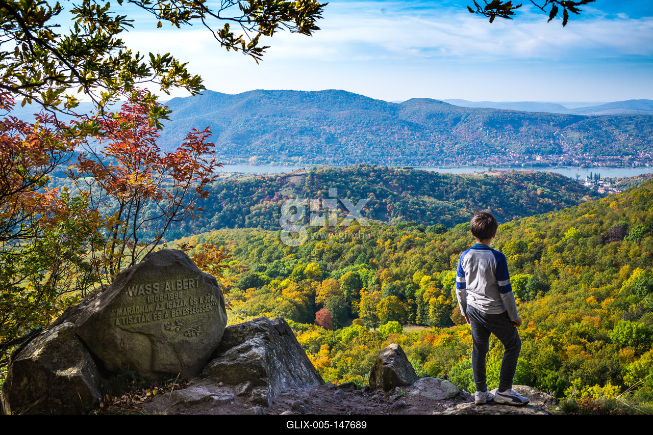Fiú néz a Dunakanyar irányába a Wass Albert-emlékkőről, a Visgrádi-hegység Borjúfő nevű kilátóhelyről. A hegység központi részén lévő sziklabérc szép és tágas kilátást enged a Dunakanyarra és a Visegrádi-hegység erdővidékére, valamint a Duna túlpartján a Börzsöny felé.
