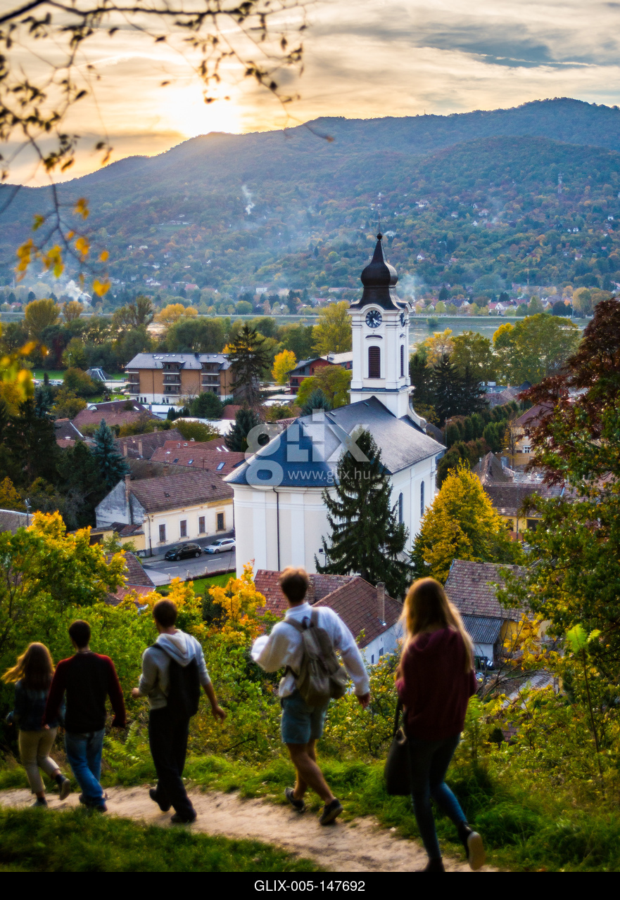 Kirándulók sétálnak alkonyatkor a hegyoldalban Visegrád felett, a Kálvária dombon. A háttérben a Keresztelő Szent János Római Katolikus Plébániatemplom. A barokk stílusú templom az 1700-as évek második felében épült. A Duna túloldalán a Börzsöny lankái és Nagymaros.