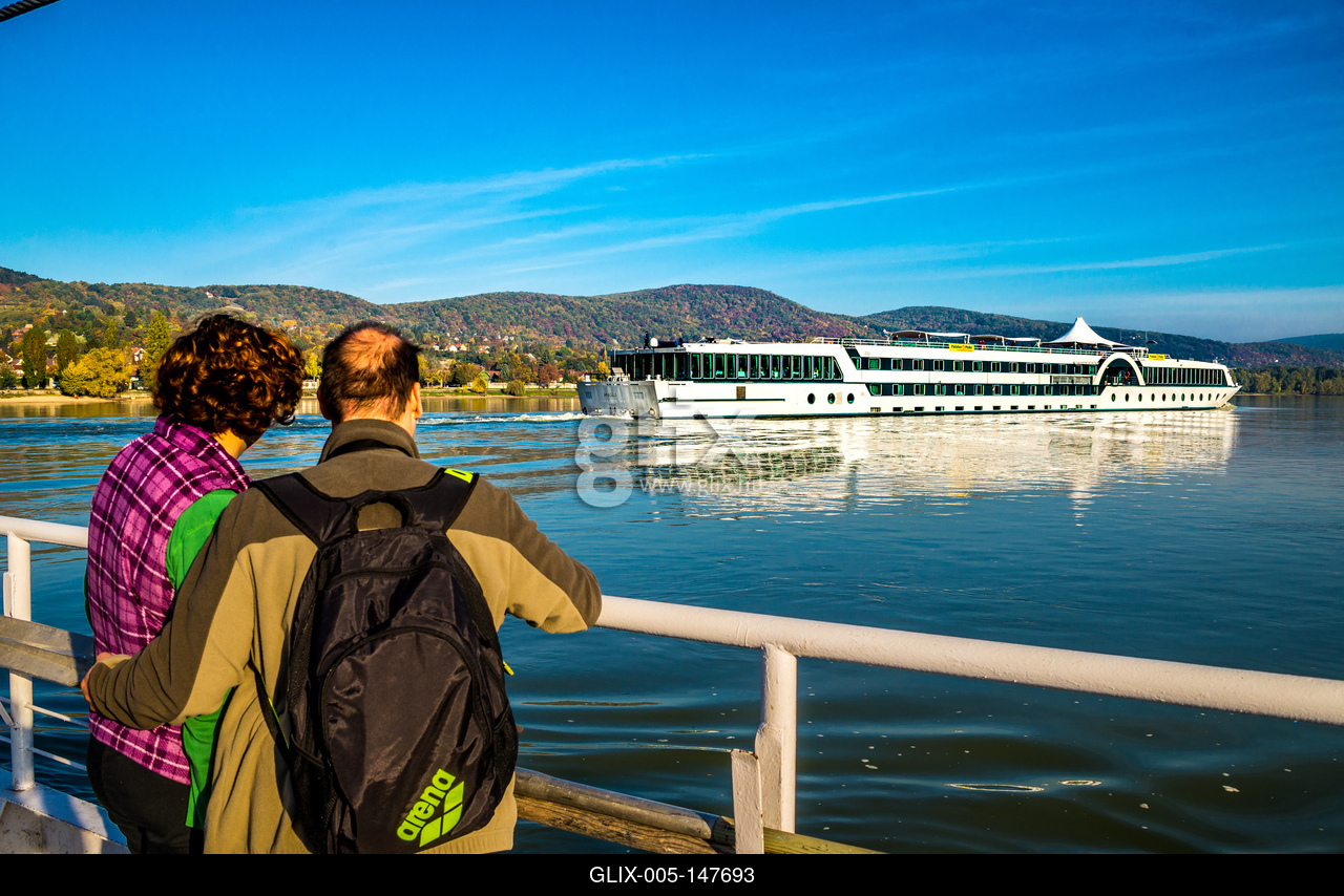 Turisták figyelik az Amadeus kirándulóhajót a Dunakanyarban, a háttérben Nagymaros és a Börzsöny vonulatai.