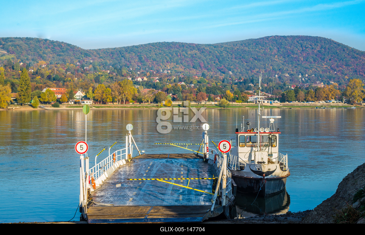 A visegrádi Révkikötő a Duna partján, a várakozó komppal, háttérben Nagymaros és a Börzsöny vonulatai.