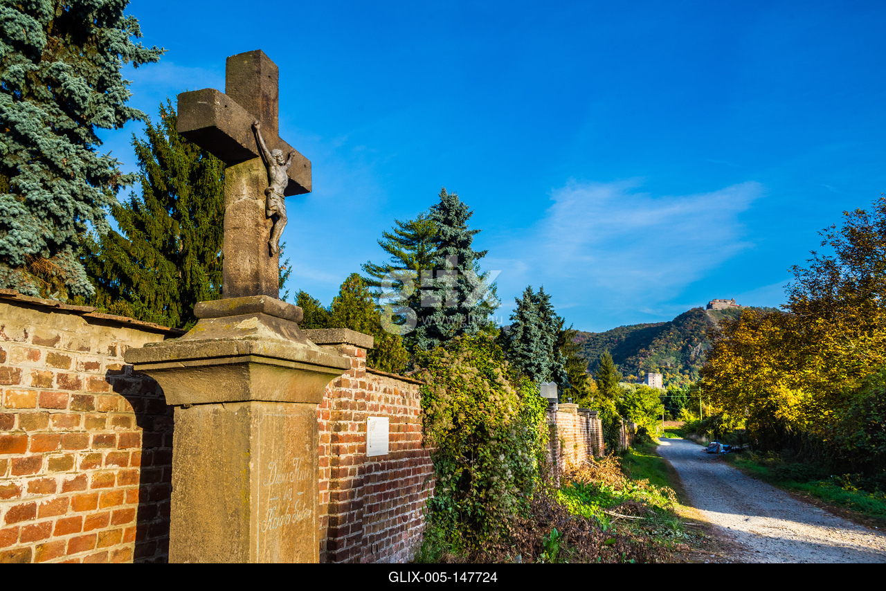 Kökereszt a temető mellett Nagymaroson, háttérben a Visegrádi vár