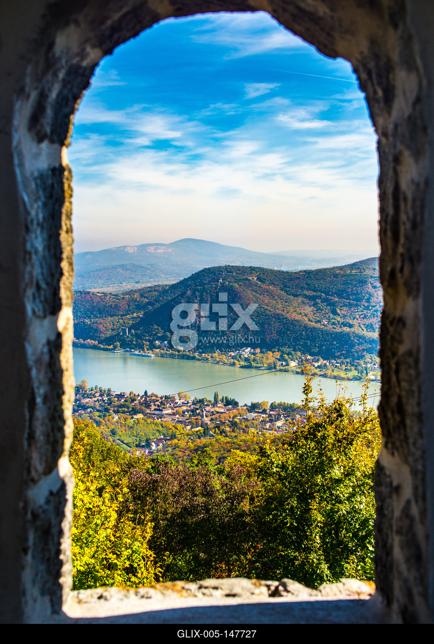 Kilátás a Julianus-kilátóról a Hegyes-tetőn, Nagymaros felett, a Börzsönyben. A Hegyes-tető 482 méter magas csúcsán álló Julianus-kilátóból a Dunára, a Visegrádi-hegységre és a Börzsönyre is páratlan panoráma nyílik.