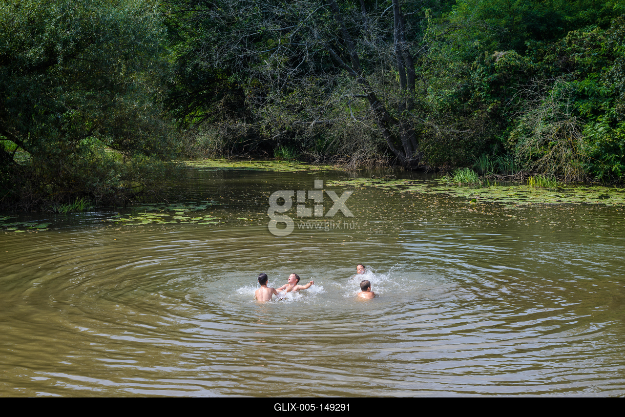 Vizitúrázó gyerekek fürdenek az Öreg-Túr folyóban, vagyis a Túr folyó szabályozatlan szakaszán, Sonkád település közelében.