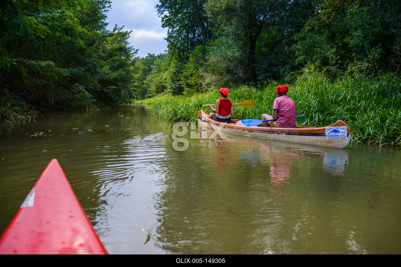 Vizitúrázók eveznek kenuikkal az Öreg-Túr folyón, vagyis a Túr folyó szabályozatlan szakaszán, Sonkád település közelében.