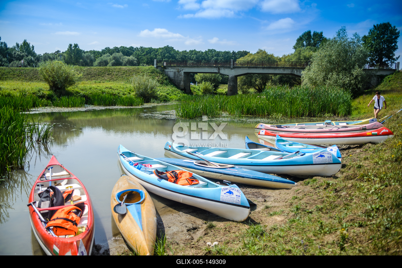 Vizitúrázók kenujai várakoznak a Túrcsatornán egy pihenőnél, Tiszaberek közelében.