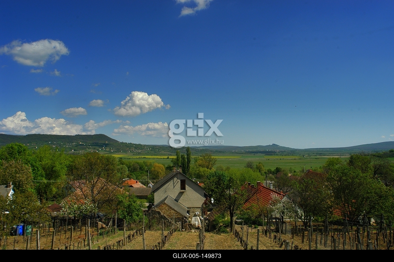 Mindszentkálla település látképe a Káli medencében.A Káli-medence, régiesen Kállai-medence a Balaton-felvidéki Nemzeti Park része.