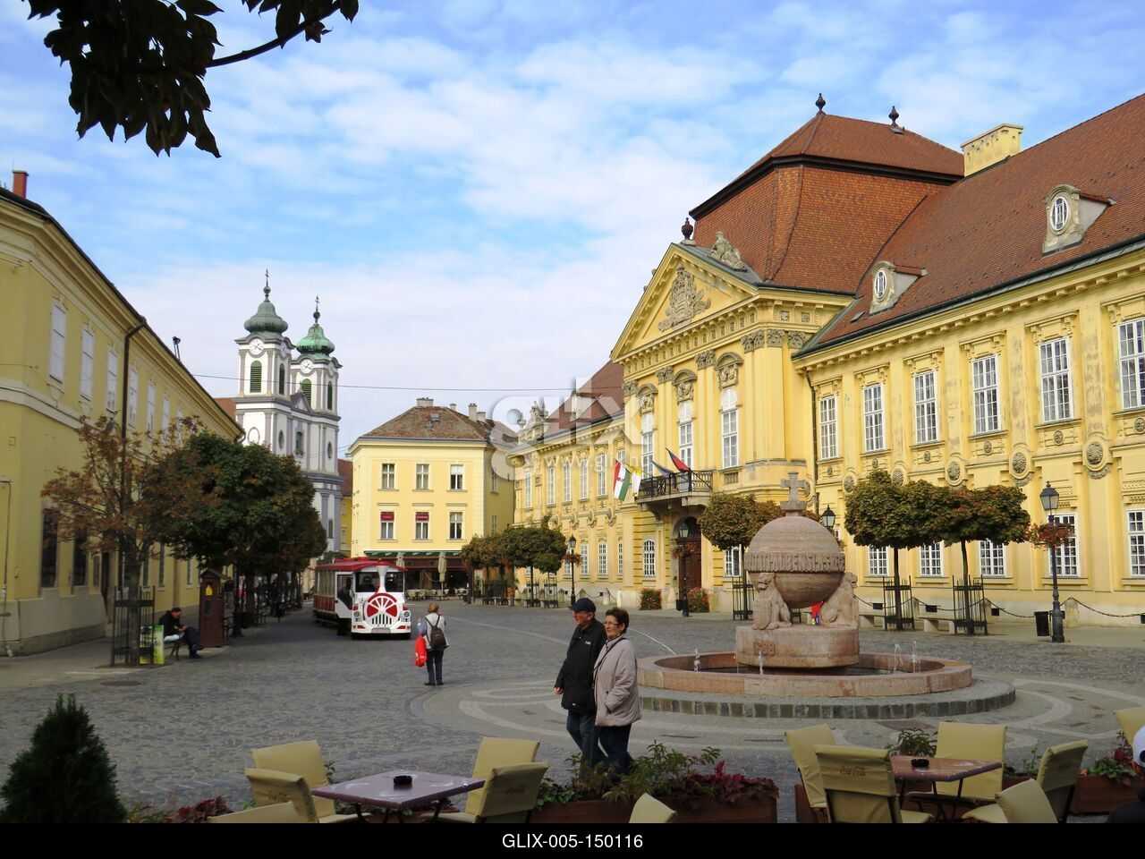 Székesfehérvár, 2018. október 22.Székesfehérvár belvárosának látképe. Jobbra a püspöki palota. 1801-ben épült fél empire-és copf stílusban. Elõl a Fehérvári jog nevû, népszerû nevén országalma szobor-díszkút. Az díszkút Ohmann Béla szobrászmûvész alkotása, 1943-ban állították fel. Hátul balra a Szent János templom tornyai.
